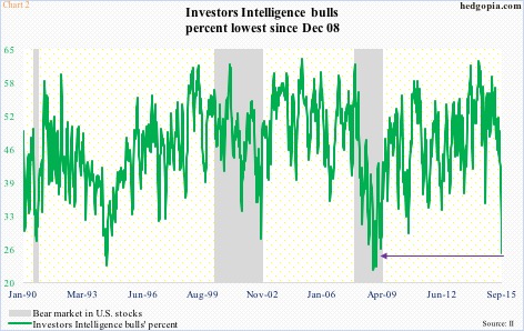 Last week, the percentage of bulls in Investors Intelligence’s weekly survey dropped to 24.7 – the lowest since 23.1 in December 2008 (Chart 2). Bears, too, jumped 4.9 points to 35.1, but their ranks have not risen enough, as they have in the past, to indicate an important bottom in stocks. The reason is those in the correction camp, which has been stuck in the 40s for the last nine weeks. Bulls, on the other hand, have just about given up.