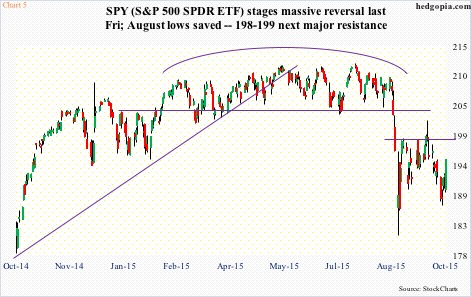 The Friday reversal is important, but important enough to nullify all the technical damage wrought on major U.S. indices by the August sell-off? Probably not. On the S&P 500, from monthly bearish MACD crossover (in April this year) to the index dropping below its 20-month exponential moving average in September, there are tons of reasons to worry long-term.
