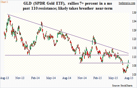 In the process, gold has conquered support-turned-resistance at $1,410. The corresponding support on GLD, the SPDR Gold ETF, lies around $110 (Chart 1). Such has been the momentum behind the yellow metal of late that the ETF filled the July 20th gap-down with ease. Shorter-term moving averages have all curled up. Even the 50-day is now attempting to go sideways.