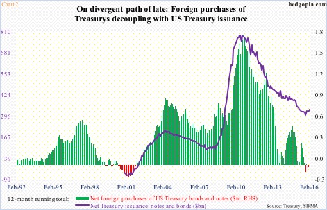 That said, (1) Treasury issuance has been rising since November last year, and (2) for the first time since 2000, foreigners have been net sellers. The green bars and the violet line are going the opposite direction, hence worth watching.