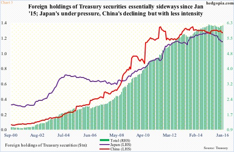 In January last year, foreigners held $6.22 trillion in Treasury securities. One year later, this had dropped to $6.18 trillion. Not a huge drop, but a drop nevertheless (Chart 3).
