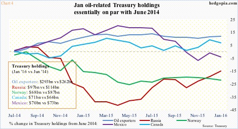 The other group worth a close watch is portrayed in Chart 4, comprised of petro dollars. The chart shows percent change in holdings beginning June 2014. Crude oil peaked in that month.